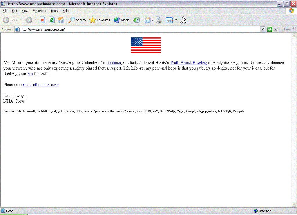 Well, last week Michael Moore was receiving death threats on his website. Who hasn’t? Now that Mikey likes to hear himself talk so much he’s telling the media that he has fought off constant attacks from hackers. (Second item) And since his feelings have been hurt so much he’s going to tattle to the police. Like they don’t have anything better to do. Did you ever think Mikey that if you weren’t such a liar, a tragedy opportunist, and the king of all assclowns people wouldn’t try to hack your site? This also reminds me of a time when the hackers were very successful.