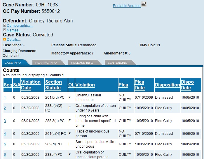 And as an added bonus here is the court record of Chaney’s pleas. It looks like this was a plea deal since the charge of rape of an unconscious person was dismissed. Damn plea deals.