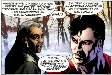 So in the story, Superman flies to Iran because an Egypt-like revolution is taking place there and he places himself between the military and the protesters. He doesn’t do anything, he just kind of floats there for 24 hours then flies off. Of course, the fictional US government has a problem with this as it may have caused an international incident. In the panel that I posted Superman says he’s tired of everything that he does as being seen as an American action and that he’s basically more a citizen and protector of the world at large.