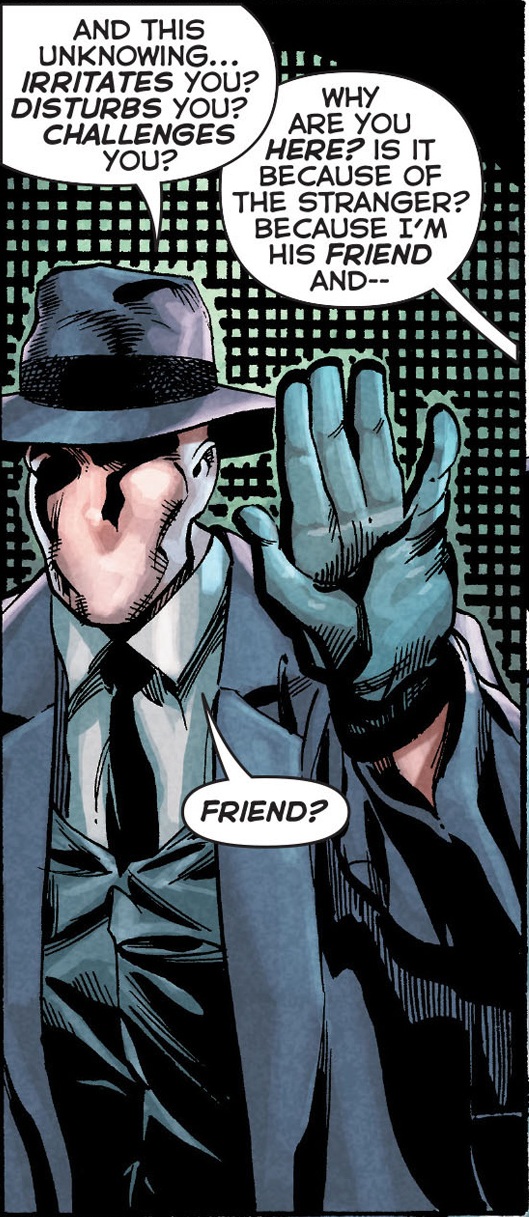 While The Phantom Stranger battles The Spectre over the disappearance of Stranger’s adopted family. The Question appears mysteriously in the lab of Dr. Terrence Thirteen. Thirteen actually calls him The Question and says that the only thing he knows about him is that Question was part of The Trinity of Sin along with Stranger and Pandora. Meanwhile Dr. Thirteen has amassed dossiers on the other two. Thirteen contacts Stranger and implies that he has information about his family. He says he doesn’t have an answer but more like a question. Heh.