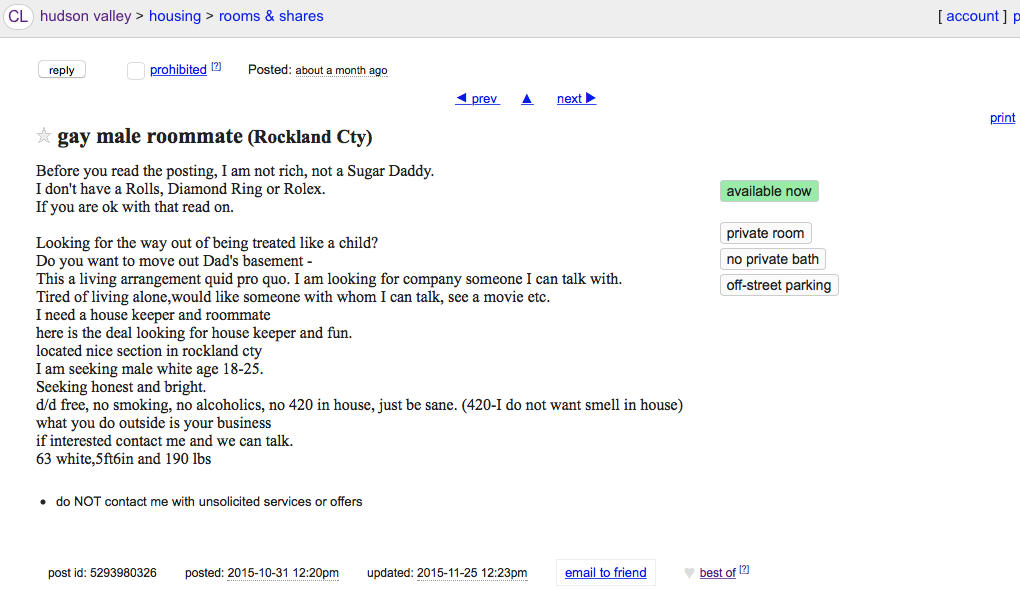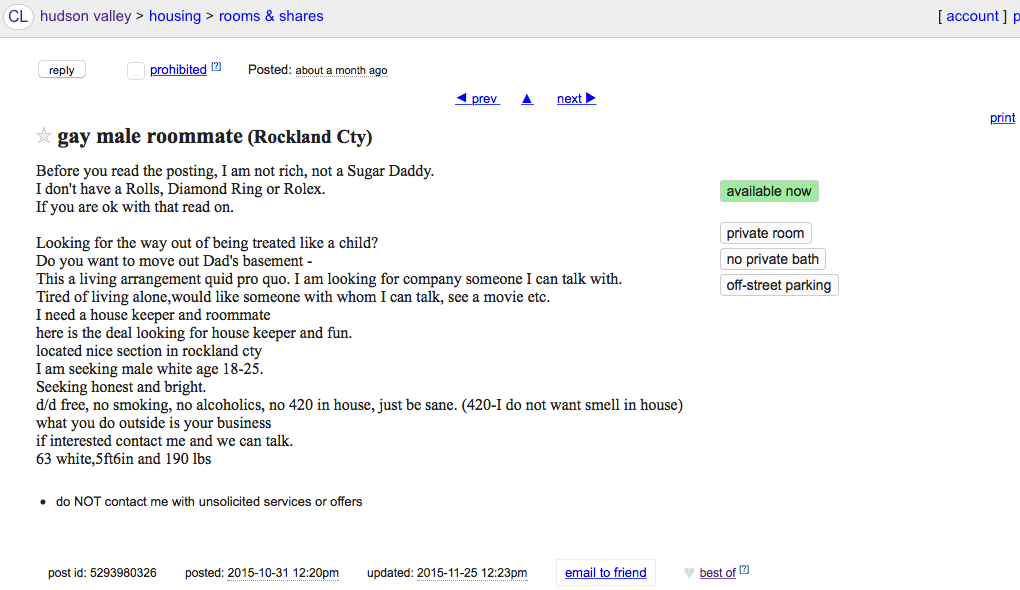 In my last post about the murder of 66-year-old Michael Wimbert in West Nyack, New York, I said that it did not appear to be ‘roommate with benefits’ situation. I may have been wrong about that. The Rockland County Times is saying that this could be the ad placed by victim Michael Wimbert…