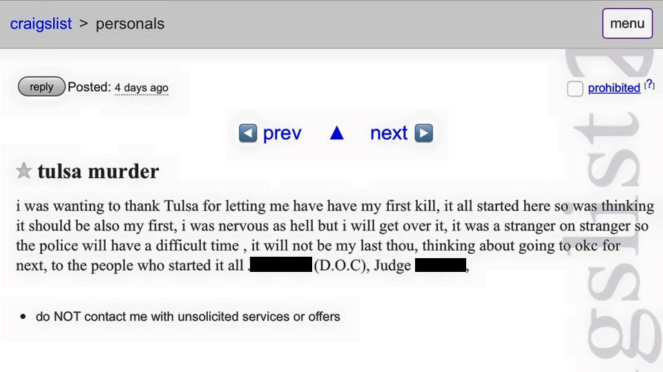 Someone in Tulsa, Oklahoma posted the above ad on craigslist recently claiming that they killed someone and are moving on to Oklahoma City to claim their next victim. I guess 2016 is starting out to be the year of web hoaxes.