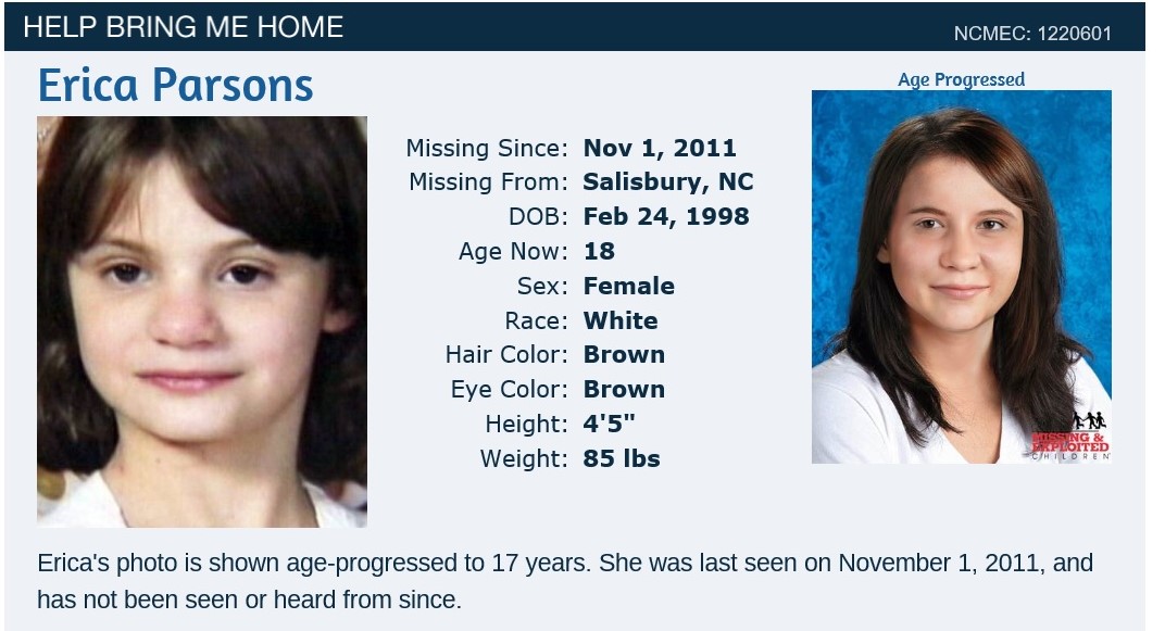 Yesterday, the FBI offered a $25,000 reward for information leading to the location of Erica Parsons. If you’ll recall, Erica went missing in 2011 from her home in Salisbury, North Carolina, but wasn’t reported missing for two more years. Her adoptive parents, Casey and Sandy Parsons, have claimed that Erica went to live with her biological grandmother in Asheville, North Carolina, but no one can prove that the woman, allegedly Irene ‘Nan’ Goodman, actually exists. The Parsonses also continued to collect the government benefits for Erica while she was missing. They were convicted of fraud and are currently serving out their sentences.