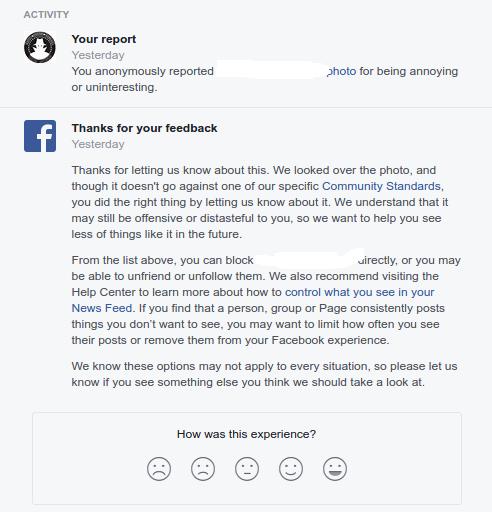 I reported the first post as harassment and this is the reply I received. I removed the names of the posters because I’m not an irrational douche, but I digress.