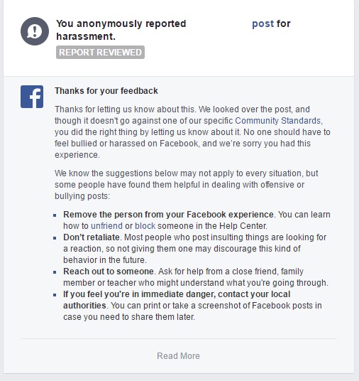 Then I reported the second posting as inciting violence, and this was the response I got from Facebook.