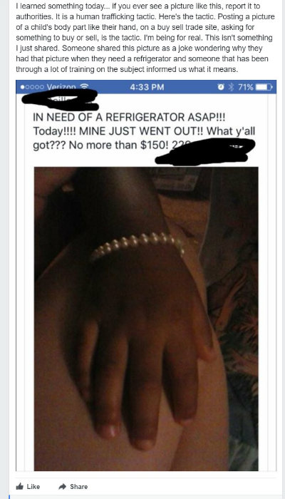 I learned something today… if you ever see a picture like this, report it to authorities. It is a human trafficking tactic. Here’s the tactic. Posting a picture of a child’s body part like their hand, on a buy sell trade site, asking for something to buy or sell, is the tactic. I’m being for real. This isn’t something I just shared. Someone shared this picture as a joke wondering why they had that picture when they need a refrigerator and someone that has been through a lot of training on the subject informed us what it means.