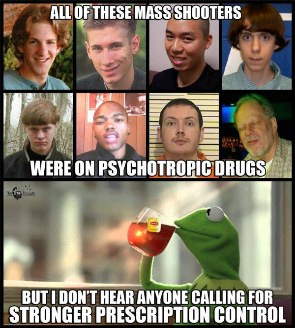 So I go to the vast cultural void that is Facebook, and I see people posting memes and bullshit about mass shooters and psychiatric drugs. You know, things like this…