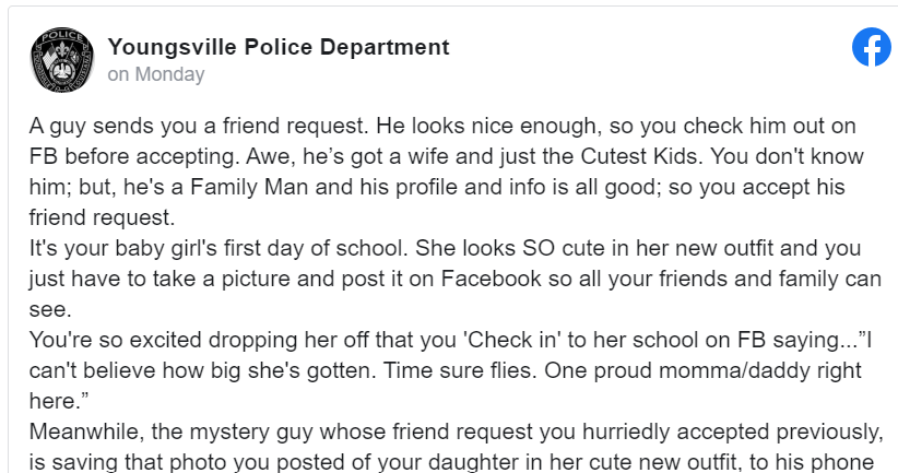 The Police Department in Youngsville, Louisiana (pop. 14,077) has posted some good advice to social media-obsessed parents on their own Facebook page recently. It starts out with some really good advice…