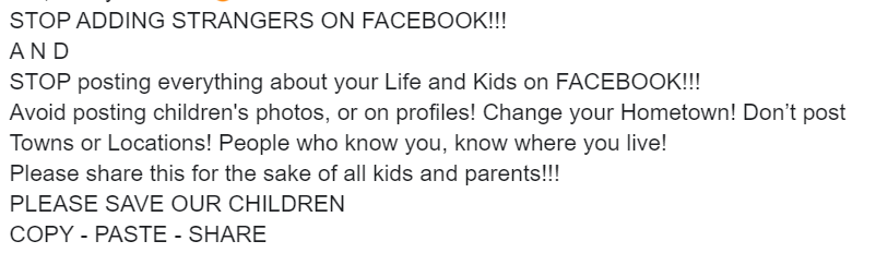 This part I agree with for the most part. While I don’t think your kids will be whisked away and shipped off to Thailand, that doesn’t mean that predators and traffickers won’t approach your kids on social media. And by posting every detail of their lives on Facebook, it gives the predators and traffickers more ammunition in their arsenal to groom your children.