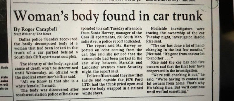 This post is not intended as an indictment against the Dallas PD. This post’s purpose is to show the frustration and cost a family has endured for almost 37 years, and how you can help.