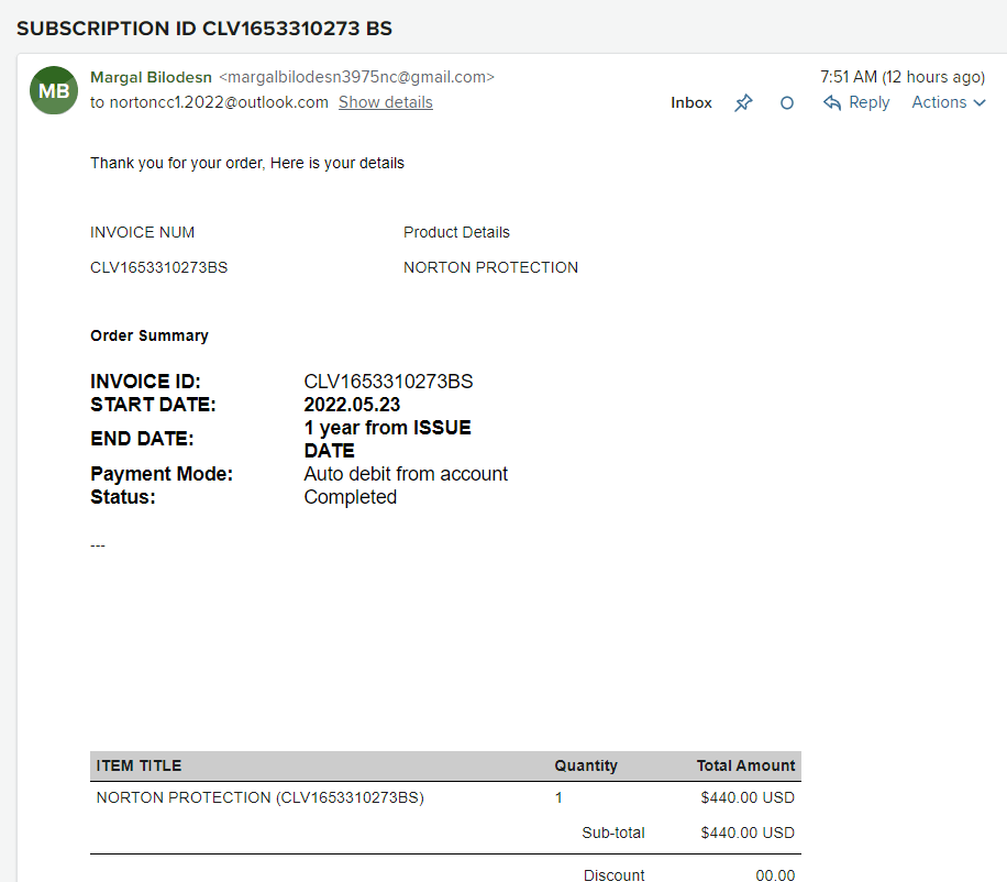 First, look at the email address it was sent from. I don’t think a company as big as Norton is going to have their accounting department use a Gmail address. Not to mention, my email address isn’t an Outlook address.