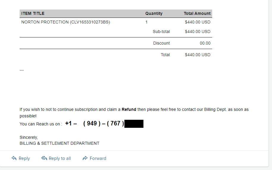It looks like an invoice from Norton Antivirus, who are about to bill me $440 for a recurring subscription. The problem is, I haven’t used any antivirus software since Windows XP, and I sure as hell never paid for it.